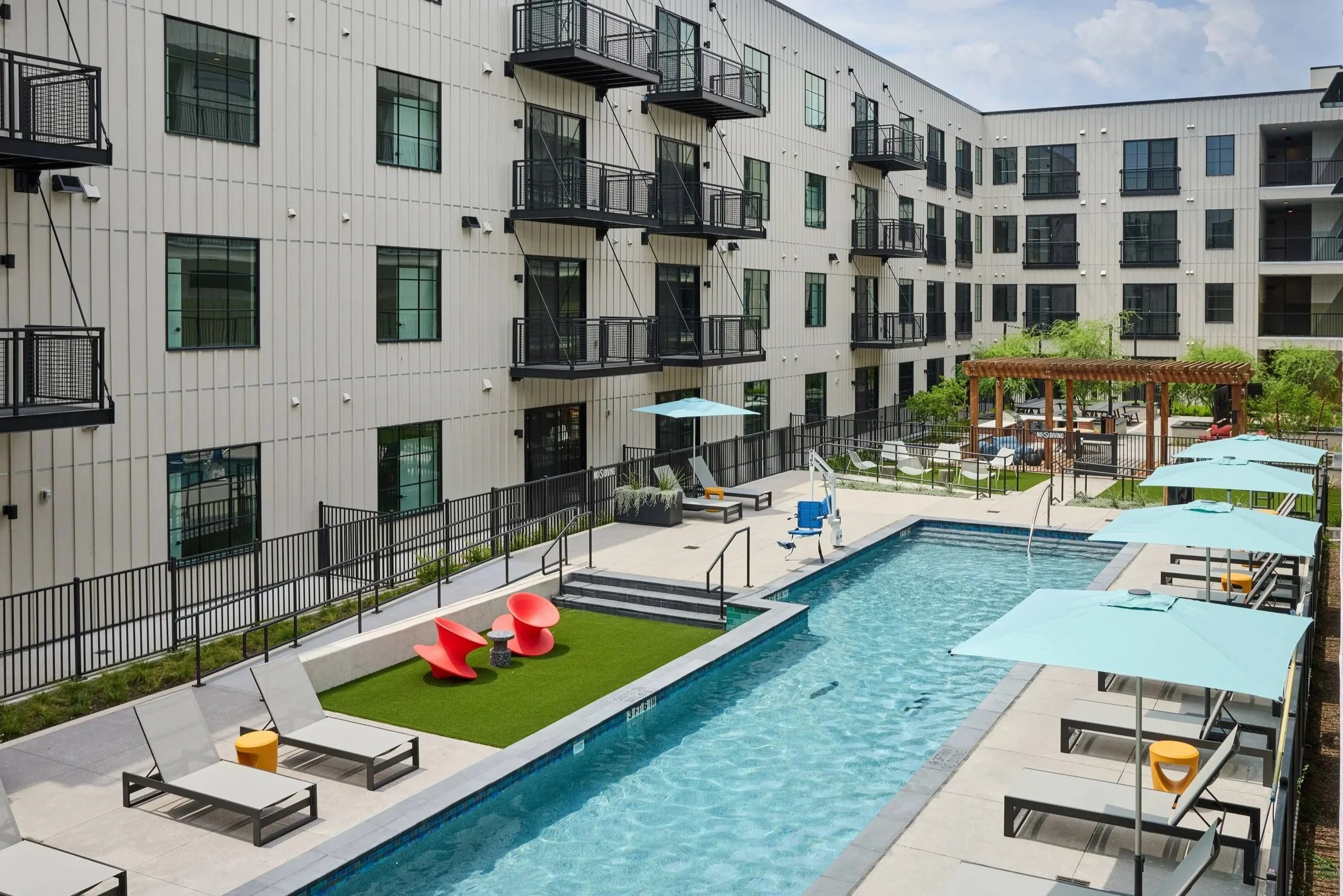 Congress Lofts also provides practical considerations such as a ground-floor parking garage and a bike storage space, as well as a dedicated dog park and dog-washing station for canine companions.